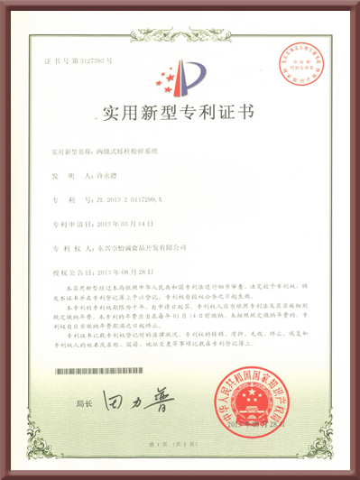 實用新型專利證書(兩級式瑤柱粉碎系統(tǒng))