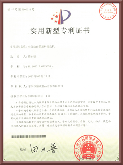 實用新型專利證書(全自動食品原料清洗機)