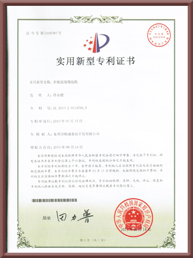 實用新型專利證書(多級直線篩選機)