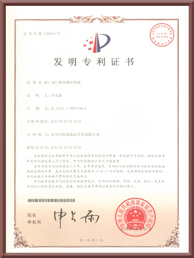 發(fā)明專利證書(雙門熱風(fēng)循環(huán)烘箱)