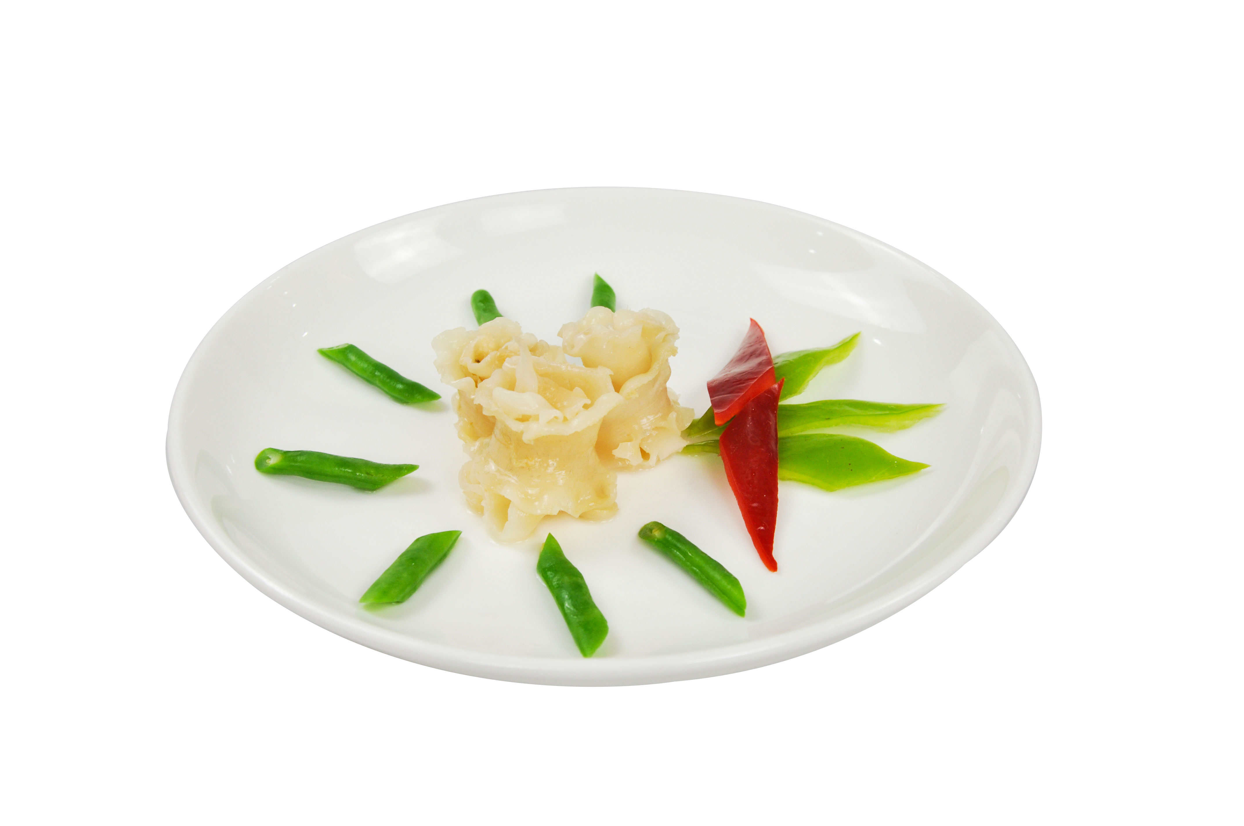 鱈魚生長于大陸架深海海域,是世界捕撈量最大的食用魚類之一,鱈魚肉豐滿多脂,味道甘美香潤,蛋白質(zhì)含量豐富,肝臟所含營養(yǎng)比例特別適合人體吸收,享有餐桌上的營養(yǎng)師之美譽。本產(chǎn)品選用深海捕撈的藍(lán)鱈魚為原料,運用專業(yè)冷鏈物流運輸設(shè)備,將藍(lán)鱈魚運送到潔凈無菌的生產(chǎn)車間內(nèi),由專人完整地切出魚肚膠,細(xì)心去除附著雜質(zhì)并避免魚肚膠表面受損,全面清洗后浸泡純凈冰水以改善質(zhì)感,再經(jīng)專用的流水生產(chǎn)線和平板速凍設(shè)備冷凍加工,使魚肚膠在短時間內(nèi)急速冷卻,充分地保留特有的鮮軟口感和內(nèi)在營養(yǎng)成分。加工后的魚肚產(chǎn)品白嫩軟滑,膠糯綿韌,嬌纏香潤,松彈緊致,解凍后烹調(diào)各式菜肴皆為桌上珍品。