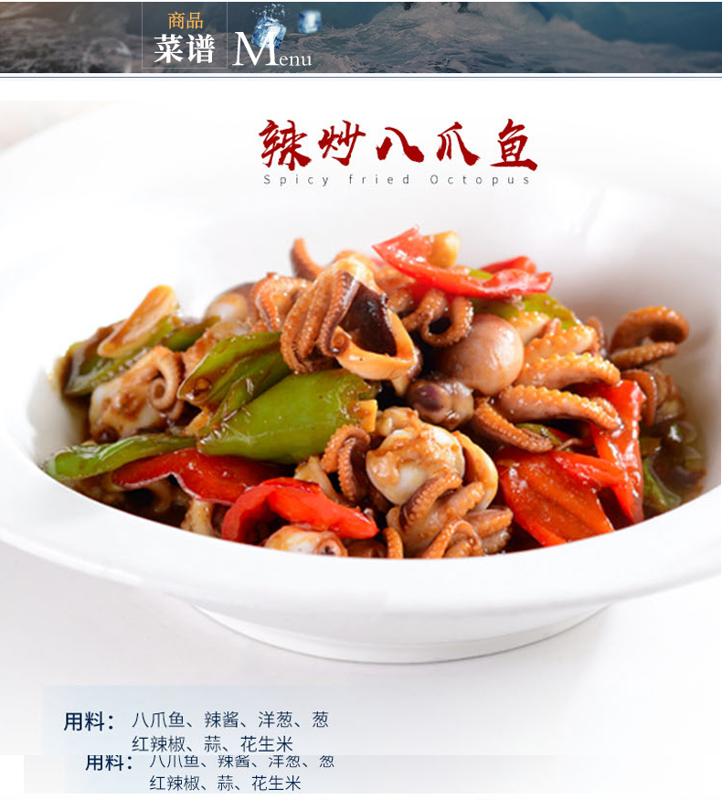八爪魚又名章魚,是一種棲身于深海的軟體動物,因擁有八條細長的觸腕而得名,其肉質爽厚脆嫩,清甜多汁,致密而富有彈性,并且含有天然的?;撬?,營養(yǎng)價值非常高,因此八爪魚不單單是美味的海鮮食材,而且也是民間食療進補的佳品。本產品取材于深海捕撈的鮮活八爪魚,以完善的冷凍保鮮技術和嶄新的高端流水生產線進行速凍加工,使八爪魚體內蘊含的營養(yǎng)成分充分保留,并維持八爪魚鮮美爽嫩的天然口感。加工后的八爪魚產品晶瑩潔白,脆彈有勁,飽滿細滑,肉汁源源不斷滲出,鮮香撲鼻而來。產品可用于烹制各類菜肴,烹調方式包括清蒸、紅燒、干鍋、燜燉、熬制滋補湯品、滾涮火鍋等,用途豐富多樣。