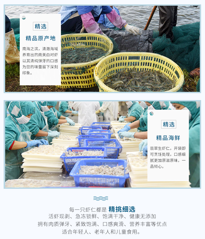南美白對(duì)蝦原產(chǎn)于南美洲太平洋沿岸海域,大多數(shù)棲息于泥質(zhì)海底,生長(zhǎng)發(fā)育條件優(yōu)異,體內(nèi)營(yíng)養(yǎng)豐富。南美白對(duì)蝦外表呈青灰色,蝦殼薄而蝦肉飽滿,肉質(zhì)鮮美并且含肉率高,因而深受人們喜愛(ài),是餐桌上常見(jiàn)的海鮮菜肴。本產(chǎn)品選用北部灣海域捕撈的鮮活白對(duì)蝦為原料,運(yùn)用專業(yè)冷鏈物流運(yùn)輸設(shè)備,把白對(duì)蝦迅速地運(yùn)送到潔凈的生產(chǎn)車間內(nèi),專業(yè)處理去頭去殼,并以完善的冷凍保鮮技術(shù)和嶄新的高端流水生產(chǎn)線進(jìn)行生產(chǎn)加工,使白對(duì)蝦仁能在新鮮狀態(tài)下加工成為速凍產(chǎn)品,最大限度地保存了鮮活白對(duì)蝦的鮮美品質(zhì)。